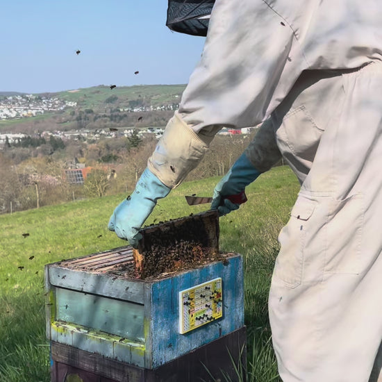 Die Pin-Stock-Karte ist die schnellste und einfachste Möglichkeit, Bienenvölker direkt am Bienenstand zu dokumentieren – auch mit klebrigen Händen oder dicken Handschuhen. Sie wird außen an der Beute befestigt und mit 15 Pins intuitiv bedient. Jede Durchsicht ist in Sekunden erfasst – direkt am Volk, ohne Papier, ohne Nachtragen am Abend und ohne Handy in der Hand. Nachdem der gesamte Bienenstand kontrolliert ist, geht man mit sauberen Händen einmal an den Völkern vorbei und scannt die Karten mit der App PSK Beekeeping. Die App erkennt automatisch die Position der Pins und überträgt alle Werte zuverlässig in die digitale Historie. So entsteht eine dauerhaft nachvollziehbare Dokumentation jedes Volkes – klar, vollständig und jederzeit abrufbar. Die PSK ist wetter- und UV-beständig, gemacht für den jahrelangen Einsatz im Freien.